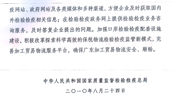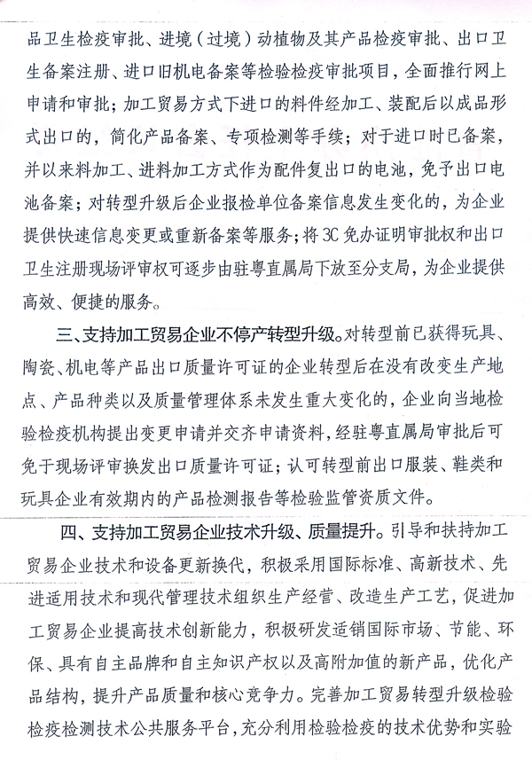 近日,国家质检总局根据广东出入境检验检疫局调研意见,出台了《国家质检总局关于促进广东省加工贸易转型升级的检验检疫措施的通知》(国质检通〔2010〕456号),支持我省建设全国加工贸易转型升级试验区。根据省政府领导意见,现将国质检通〔2010〕456号文转发给你们,请认真组织学习宣传,配合做好相关工作。同时,各地、各部门要借鉴国家质检总局和广东出入境检验检疫局的做法,积极采取有效措施,为加工贸易企业转型升级提供优质、高效的服务。