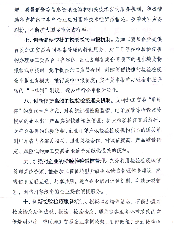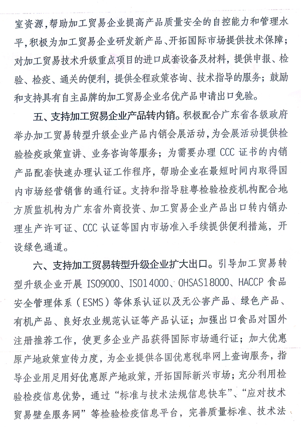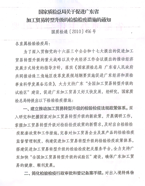 近日,国家质检总局根据广东出入境检验检疫局调研意见,出台了《国家质检总局关于促进广东省加工贸易转型升级的检验检疫措施的通知》(国质检通〔2010〕456号),支持我省建设全国加工贸易转型升级试验区。根据省政府领导意见,现将国质检通〔2010〕456号文转发给你们,请认真组织学习宣传,配合做好相关工作。同时,各地、各部门要借鉴国家质检总局和广东出入境检验检疫局的做法,积极采取有效措施,为加工贸易企业转型升级提供优质、高效的服务。